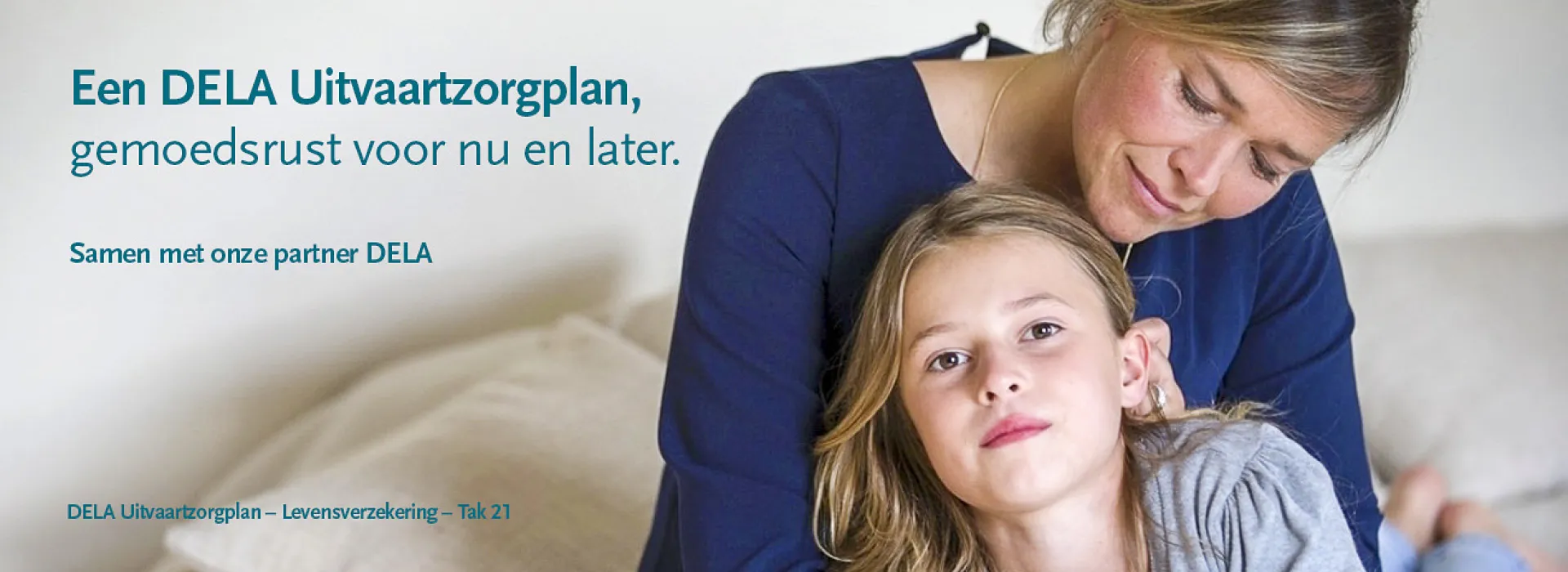 DELA Natura- en levensverzekeringen N.V. – Belgisch bijkantoor (ondernemingsnr. 0665.931.229) gelegen te Noorderplaats 5 bus 2 te 2000 Antwerpen, bijkantoor van DELA Natura- en levensverzekeringen N.V., vennootschap naar NL recht (KvK-nummer 17078393), gelegen te Oude Stadsgracht 1, 5611DD Eindhoven, NL, toegelaten voor Tak 21 levensverzekeringen onder codenr. 2864; fabrikant DELA Uitvaartzorgplan, levensverzekering Tak 21 onderworpen aan BE recht - dekt levenslang uw uitvaartkosten voor het bedrag waarvoor u verzekerd bent. Offerte en premieberekening : www.dela.be en/of uw makelaar. Klachten: contact@dela.be of Ombudsman Verzekeringen (de Meeûsplantsoen 35, 1000 Brussel). Aan deze tekst kunnen geen rechten worden ontleend. Enkel de Algemene en Bijzondere Voorwaarden zijn bindend.